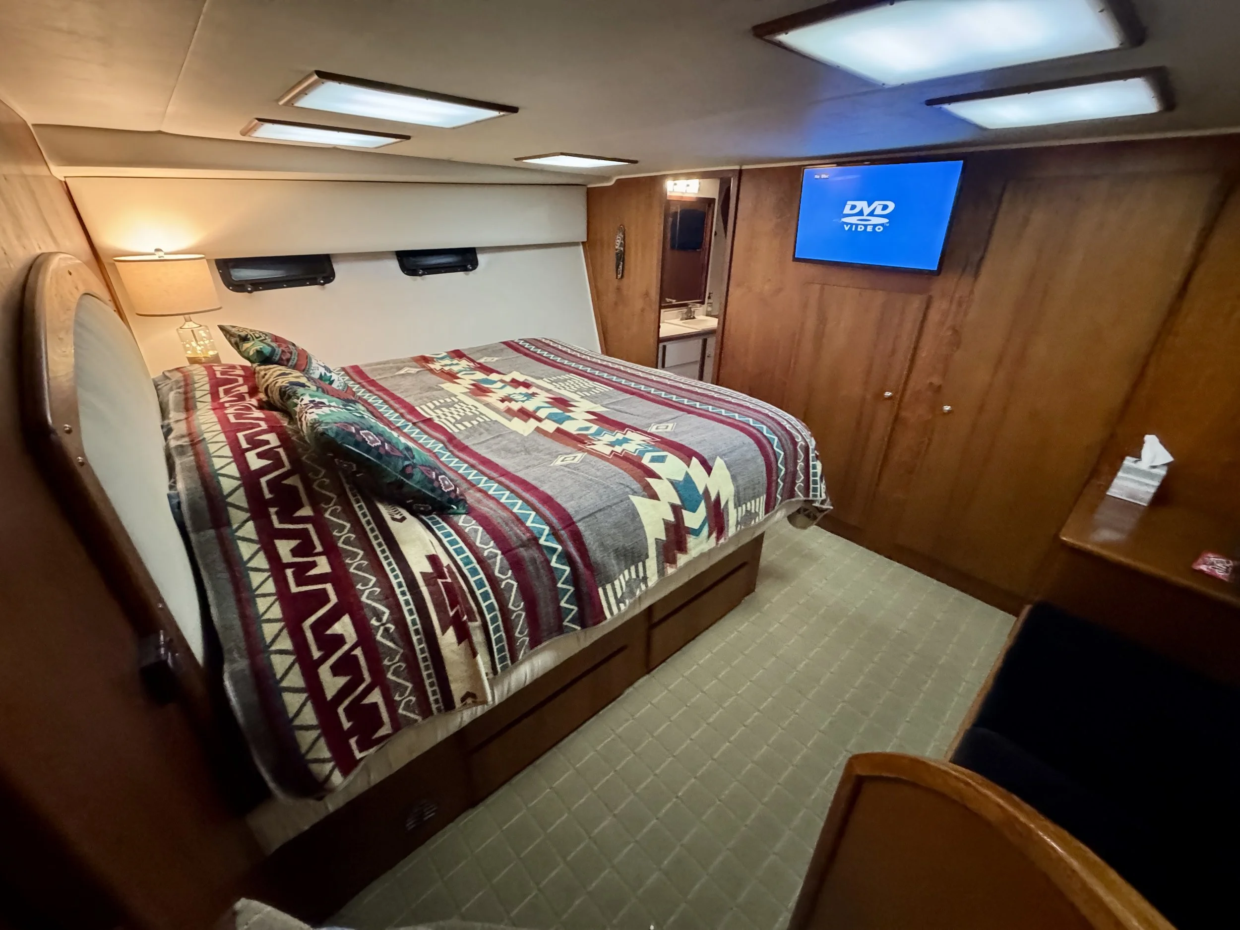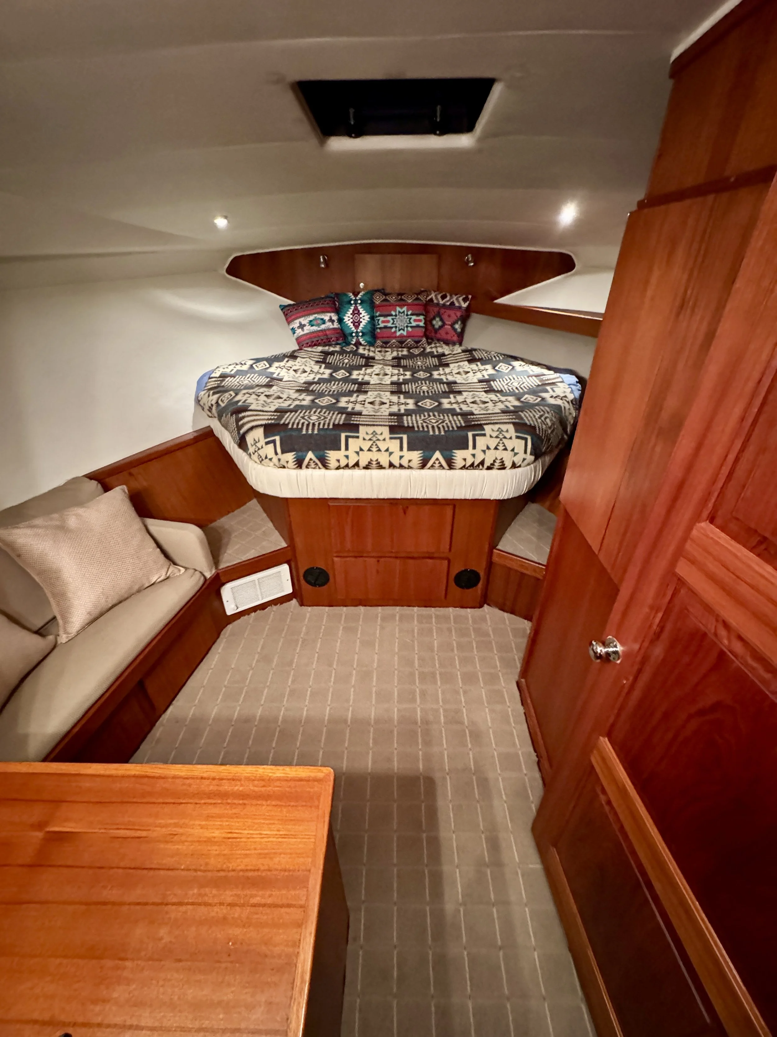 Retreat to the forward stateroom, featuring a sumptuous centerline queen berth and comfortable seating, creating a secluded oasis for relaxation and rejuvenation. With two access points to the forward head/shower, privacy and convenience are effortlessly combined to cater to your every need.